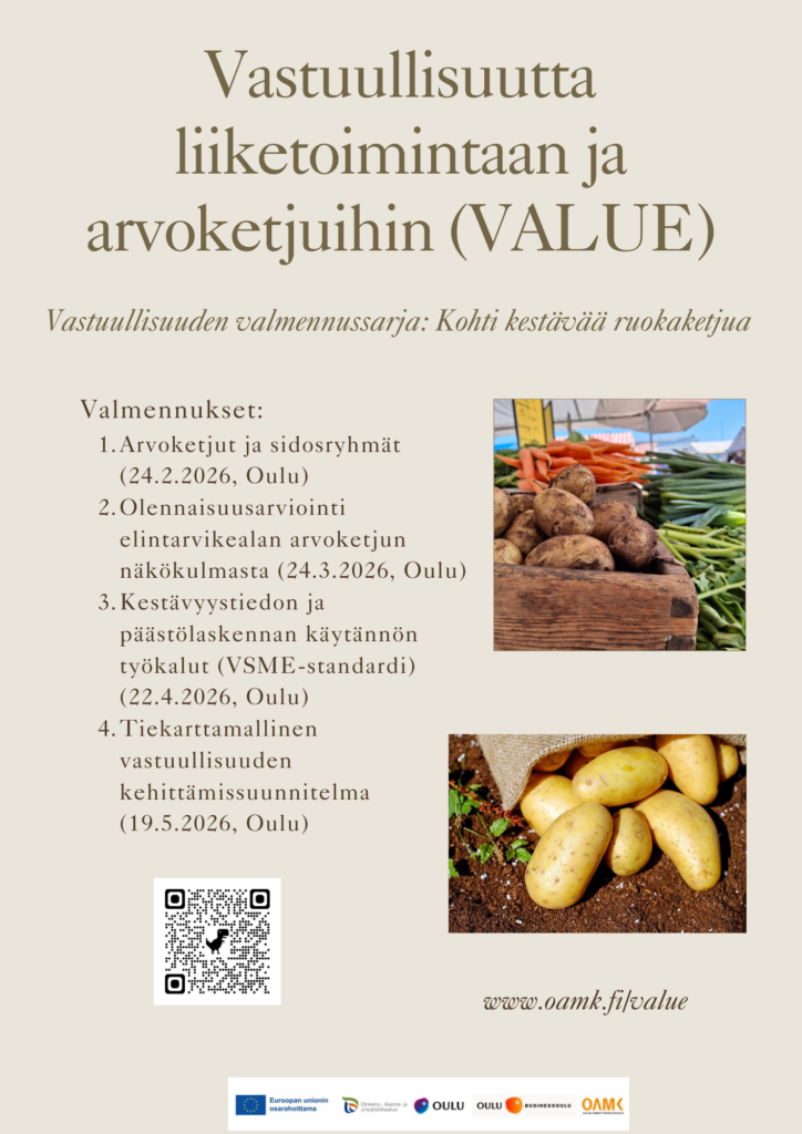 Valmennussarjan tarjoaa VALUE – Vastuullisuutta liiketoimintaan ja arvoketjuihin -hanke (BusinessOulu ja Oulun ammattikorkeakoulu 2024–2027). Hanke on Euroopan Unionin osarahoittama.